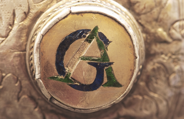 Croix de procession : bouton du noeud, lettres G AImmatriculation