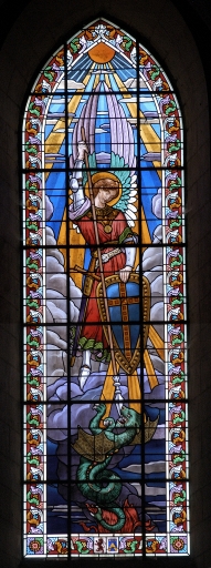 Verrières à personnages des baies 3 à 6, 8, 17 à 24, 100 à 104, 00 : Sacré Coeur, Saints Aubin, Louis, Pierre, Augustin, Jean, François d'Assise, Joachim, Michel, Immaculée Conception, Sainte Anne et verrières décoratives des baies 1, 2, 105 à 108,