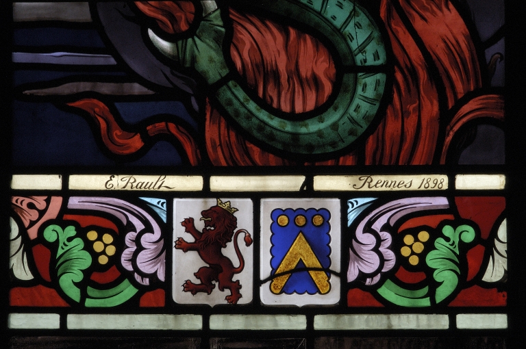 Verrière de la baie 00, saint Michel : armoiries des familles Léon des Ormeaux et Guérin de la GrasserieImmatriculation