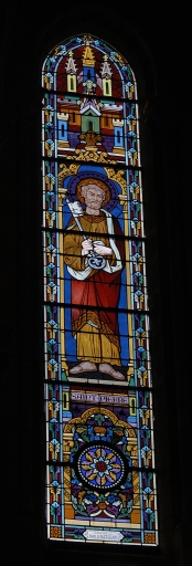 Verrières à personnages des baies 3 à 6, 8, 17 à 24, 100 à 104, 00 : Sacré Coeur, Saints Aubin, Louis, Pierre, Augustin, Jean, François d'Assise, Joachim, Michel, Immaculée Conception, Sainte Anne et verrières décoratives des baies 1, 2, 105 à 108,