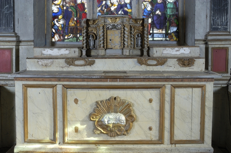 Ensemble du maître-autel : autel, tabernacle, 2 gradins d'autel, retable, 3 degrés d'autel, 2 armoires,