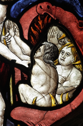 Verrière à personnages de la maîtresse-vitre (baie 0) : Passion du Christ, Résurrection, Descente aux enfers, Dieu le père,