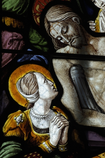 Verrière à personnages de la maîtresse-vitre (baie 0) : Passion du Christ, Résurrection, Descente aux enfers, Dieu le père,
