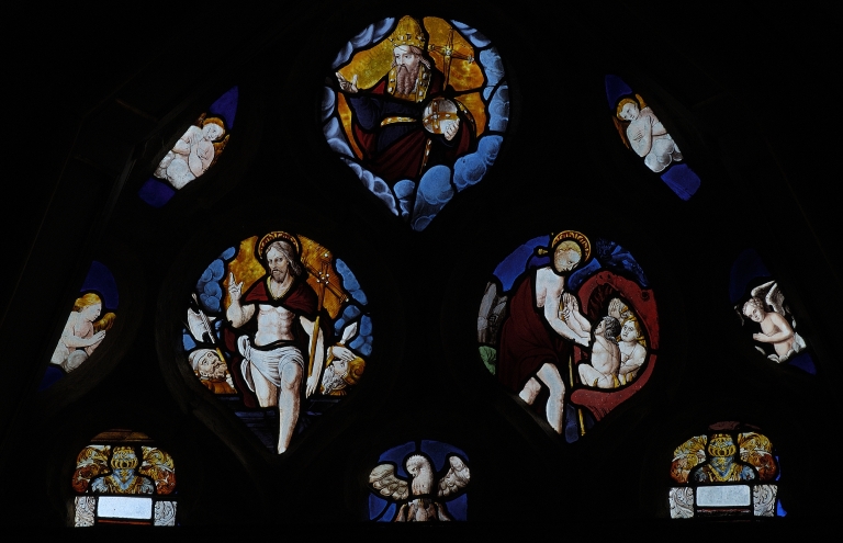 Verrière à personnages de la maîtresse-vitre (baie 0) : Passion du Christ, Résurrection, Descente aux enfers, Dieu le père,
