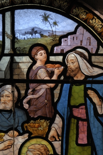 Ensemble de 11 verrières à personnages : Education de saint Louis, Offrande de la France au Sacré Coeur, Scènes de la vie chrétienne,