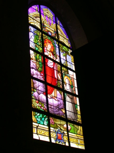 Ensemble de 3 verrières à personnages des baies 8, 10, 00 : Apparition du Sacré Coeur à sainte Marguerite-Marie, Apparition de Notre-Dame de Lourdes à sainte Bernadette (?), Saint Crépin et Saint Crépinien,