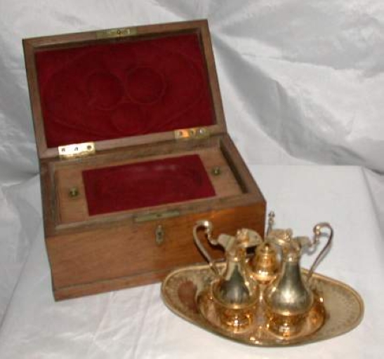 Paire de burettes avec leur bassin et une clochette dans leur boîte,