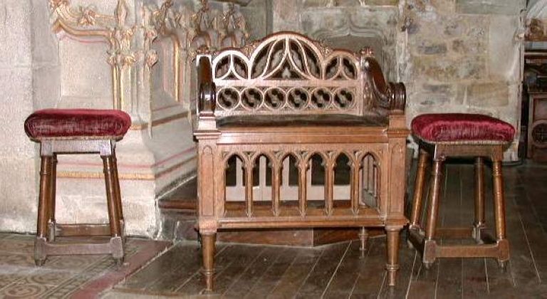 Fauteuil de célébrant et 2 tabourets d'église,