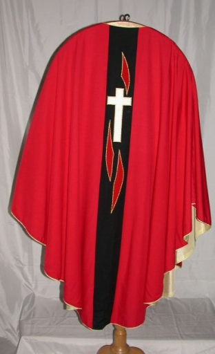 Ornement rouge : chasuble, étole, manipule, voile de calice et bourse de corporal,