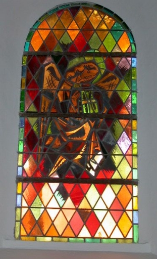 Verrières des baies 1 à 00 : Tétramorphe ; colombe ; blé ; vigne ; croix ; sainte Bernadette Soubirous,