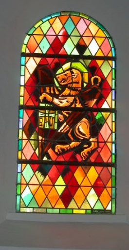 Verrières des baies 1 à 00 : Tétramorphe ; colombe ; blé ; vigne ; croix ; sainte Bernadette Soubirous,