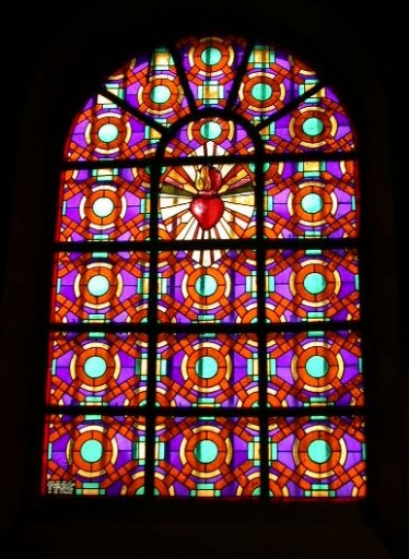 Verrières des baies 1 à 00 : Tétramorphe ; colombe ; blé ; vigne ; croix ; sainte Bernadette Soubirous,