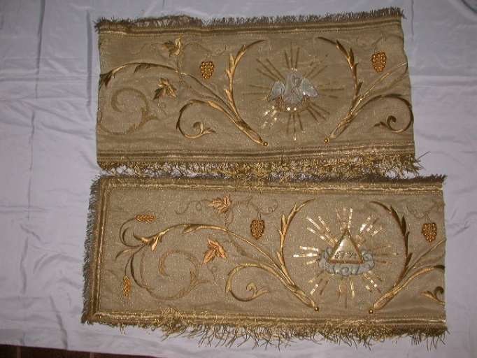 Garniture de dais de procession : éléments portant le Pélican mystique et le Triangle mystiqueImmatriculation