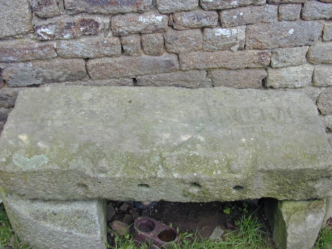 Vue du linteau de fenêtre déposé et portant l'inscription : 1638 / MEM / IHImmatriculation