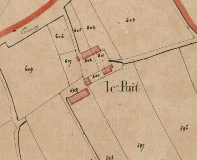 Vue de la ferme sur le cadastre napoléonien de 1827 : parcelles 599, 602, 607Immatriculation