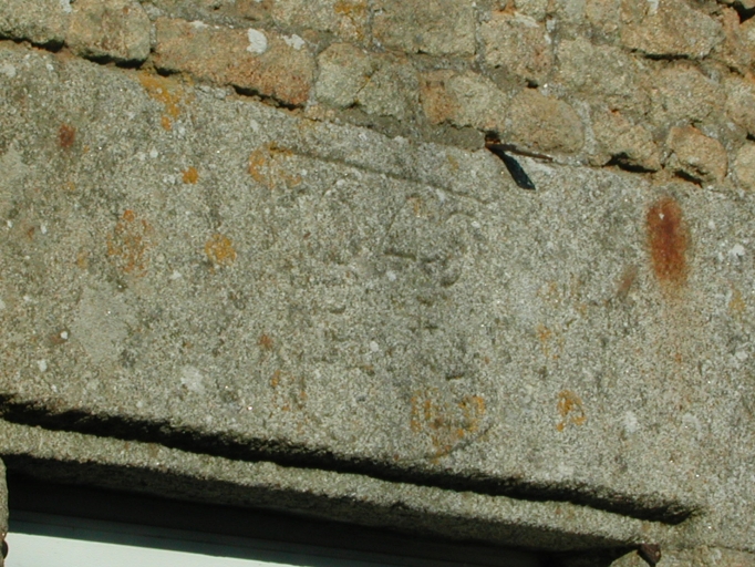 Détail du linteau de porte portant un blason et l'inscription : 1645 (illisible)Immatriculation