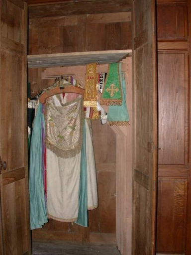 Meubles de sacristie : chasublier, chapier, armoires, bureau, lambris,