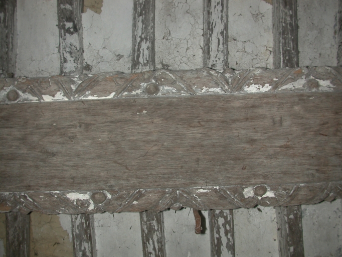 Intérieur du corps de logis nord : détail de la poutre centrale de la salle est de l'étageImmatriculation