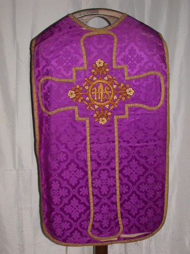 Ornement violet 2 : chasuble, étole, bourse de corporal, voile de calice et manipule,