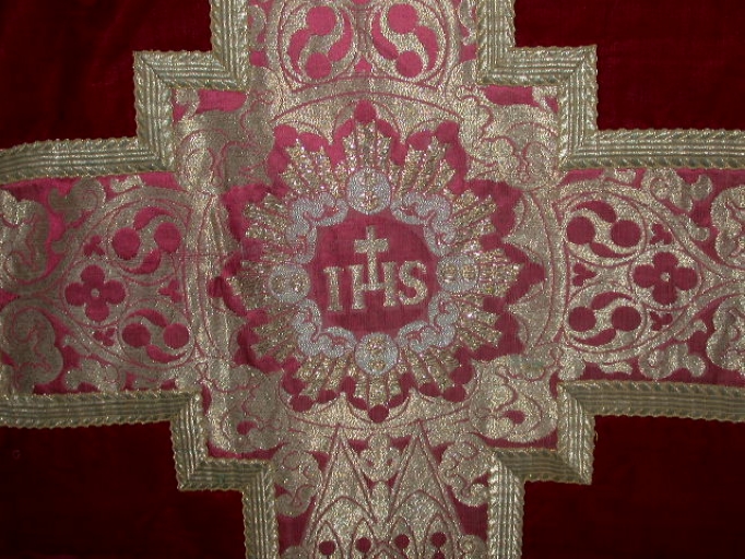 Ornement rouge 1 : chasuble, bourse de corporal, étole, manipule, voile de calice,