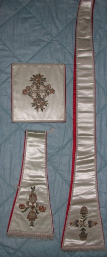 Ornement blanc 5 : chasuble, bourse de corporal, étole, manipule, pale, voile de calice,