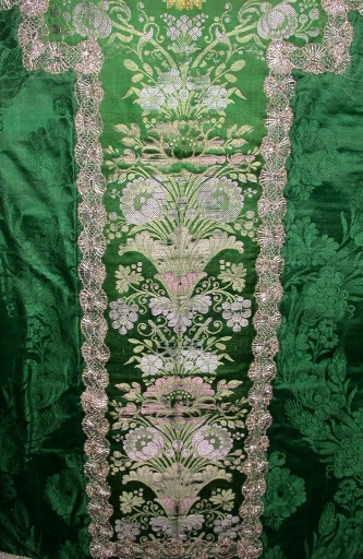 Ornement vert 1 : chasuble, bourse de corporal, étole, manipule, pale, voile de calice,