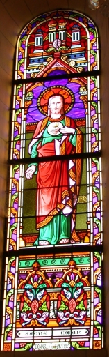 Verrières à personnages (baies 0 à 2, 7, 8, 17) : Sacré Coeur, Saint Martin de Tours, Saint Augustin, Notre-Dame de Lourdes, Sainte Anne, Saint Joseph, Saint Isidore, Baptême du Christ et verrières décoratives (baies 3 à 6, 9 à 16),
