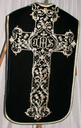 Ornement noir 1 : chasuble, bourse de corporal, étole, manipule, voile de calice,