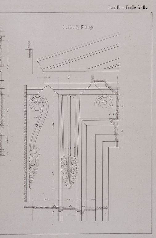 Elévation antérieure, détail de sculpture, vers 1860, par Leroux. Archives de la SNCF, groupe études et bâtiments, Rennes.Immatriculation