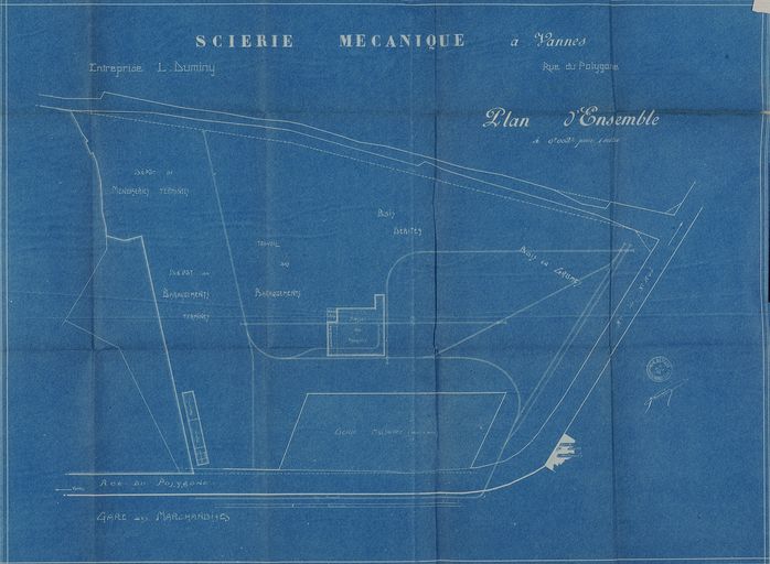La Boulonnaise. Demande d'établissement d'une scierie mécanique. Plan d'ensemble par Edmond Gemain, 1918. AD Morbihan 5M232.Immatriculation