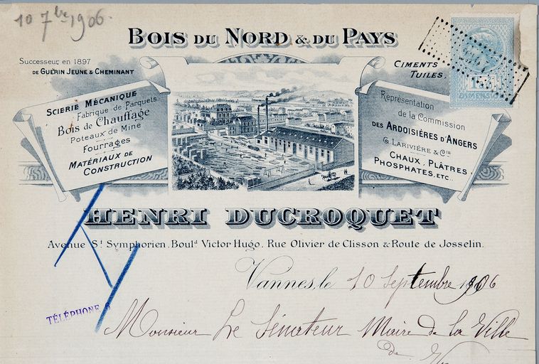 Scierie ; usine de fabrication de matériaux de construction dite Bois du Nord et du Pays Henri Ducroquet, 13 avenue Saint-Symphorien ; avenue Victor Hugo ; rue Olivier de Clisson ; rue des Quatre frères Créac'h (Vannes),