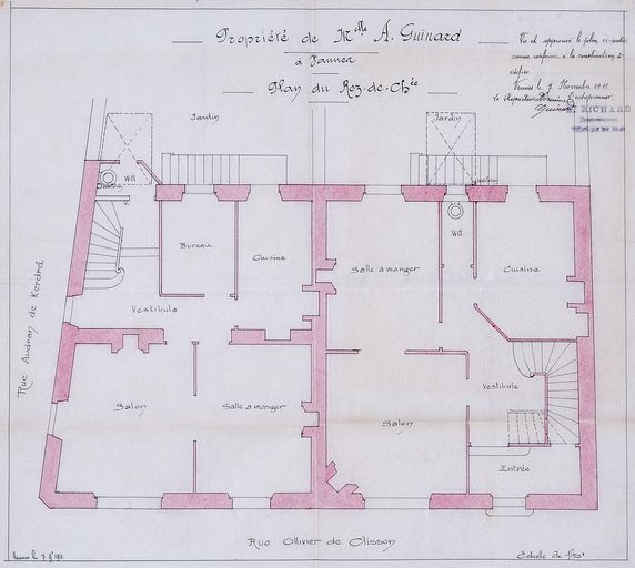 Plan du rez-de-chaussée de la propriété de melle Guinard par Richard, 1911. AM Vannes 5I162.Immatriculation