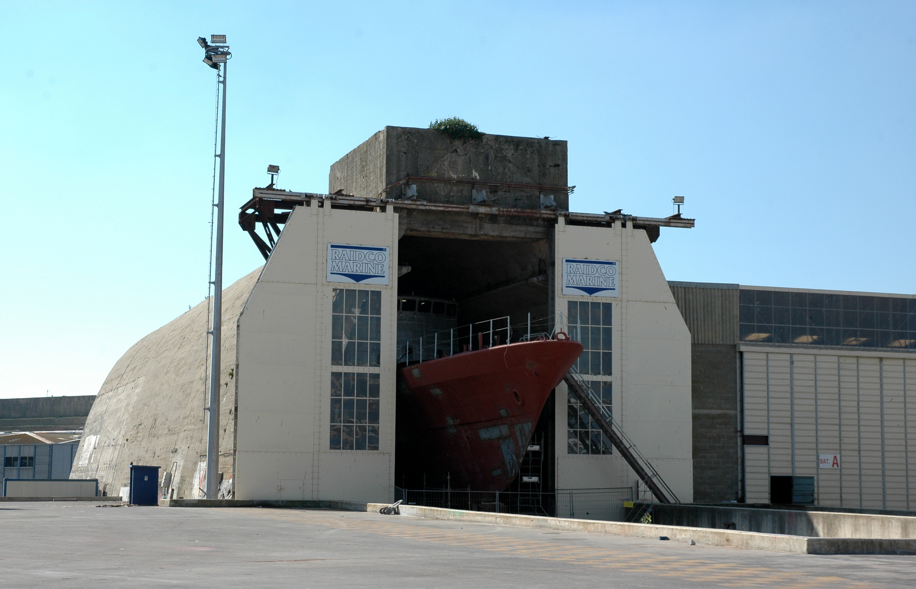 Dom-bunker Ouest dit "T6" avec encuvement pour canon antiaérien puis usine de construction navale, aire de réparation navale, port de pêche de Keroman (Lorient),