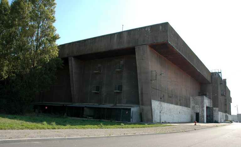 Vue de l'angle ouest : contreforts et dalle de couverture (2005). Les quatres entrées/sorties correspondent à la caserne dite des 1000Immatriculation