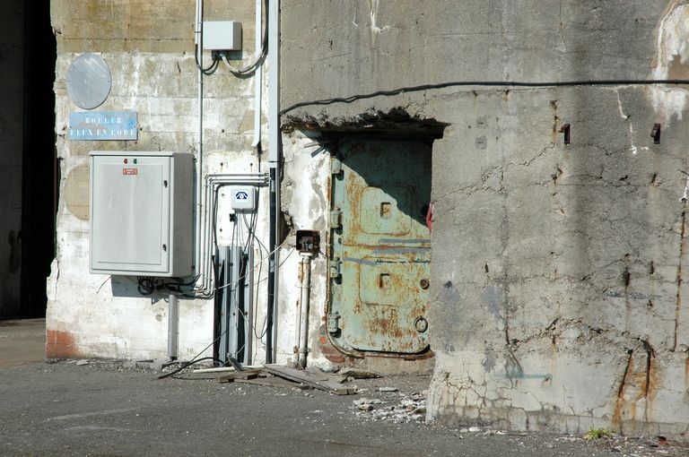 Vue de l'entrée de l'une des deux casemates pour mitrailleuse flanquant la porte est (2005). Peinte en verte, porte blindée à deux vantaux protégeant l'entrée de la casemateImmatriculation