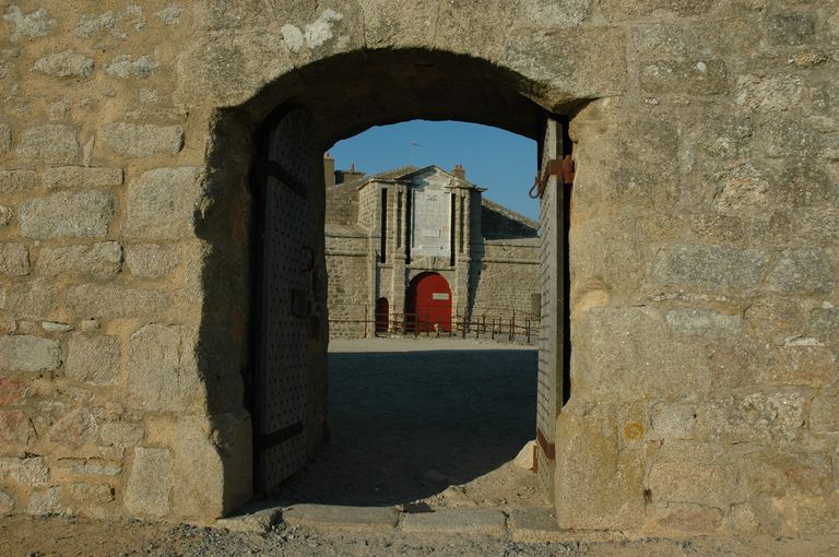 Vue de la citadelle de Port-Louis : porte monumentale de la demi-lune depuis le bastion Saint-Nicolas (rempart de la ville)Immatriculation