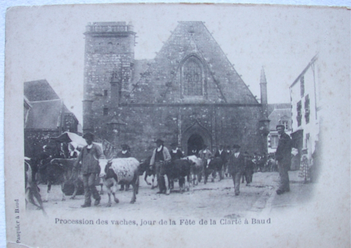 Procession des vaches le jour de la fête de la Clarté. Vers 1910. Carte postale ancienne, édit. Pasquier, Baud. (AD Morbihan, série 9 Fi)Immatriculation
