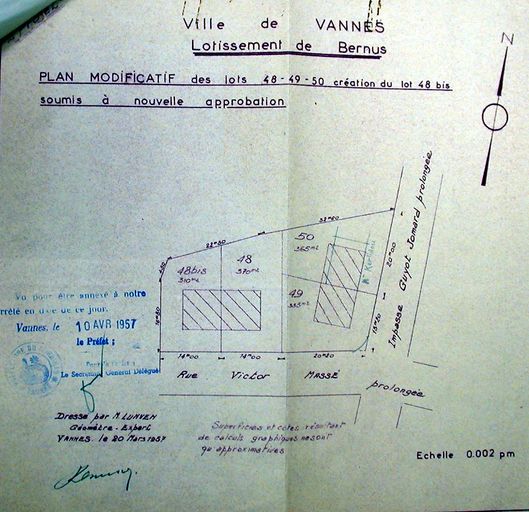 Plan modificatif des lots 48, 49, 50 création du lot 48 bis par Lunven, 20 mars 1957. AM Vannes 1O221.Immatriculation
