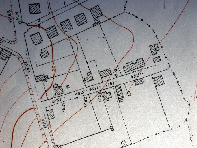 Plan de la ville par Guillerminet, Ministère de la Reconstruction, 1947 : détail de l'impasse des Chênes verts. AM Vannes 9Fi.Immatriculation