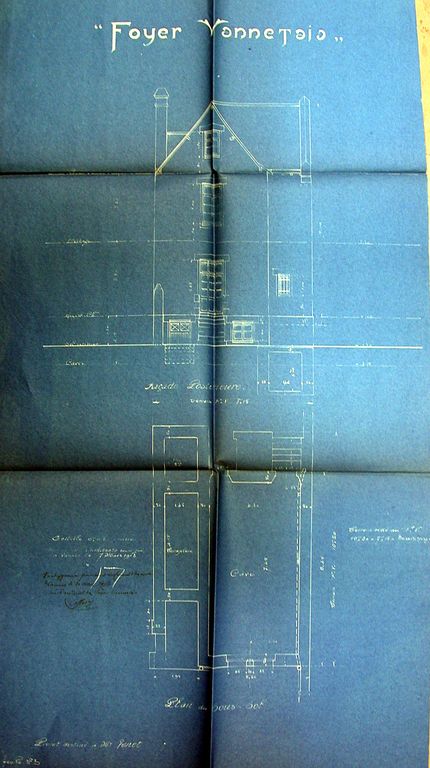 Elévation de la façade postérieure et plan de la cave de la maison Genet, 7 mars 1913 par Gemain. AM Vannes 5I162.Immatriculation