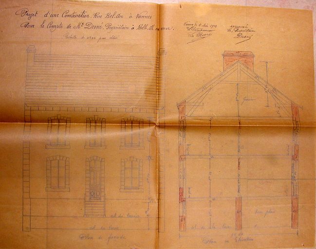 Projet de construction rue Bel-Air à Vannes : élévation et coupe, pour le compte de monsieur Desné par Le Bosco, 5 mai 1912. AM Vannes 5 I 162.Immatriculation