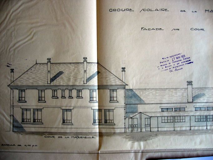 Elévation sur cour, dressée par Thiévard, 30 juillet 1930 : détail : pavillon de la maternelle. AD Morbihan 2O 260/12.Immatriculation