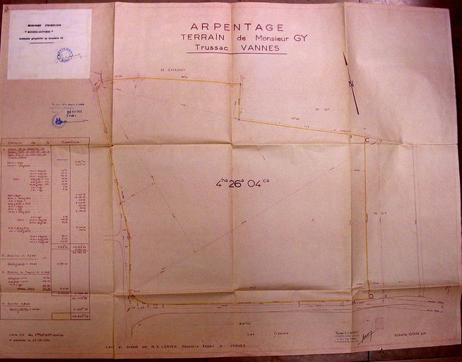 Arpentage du terrain de monsieur Gy par X. Lunven, 1955. AM Vannes 1O221.Immatriculation