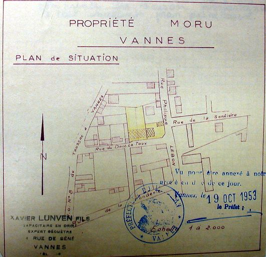 Plan de situation du lotissement Moru dressé par X. Lunven, 1953. AM Vannes 1O221.Immatriculation
