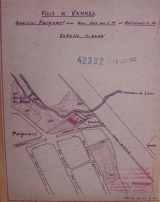 Plan de situation de l'extension de l'ancien entrepôt du CM approuvée le 10 octobre 1962. AM Vannes 5I162.Immatriculation