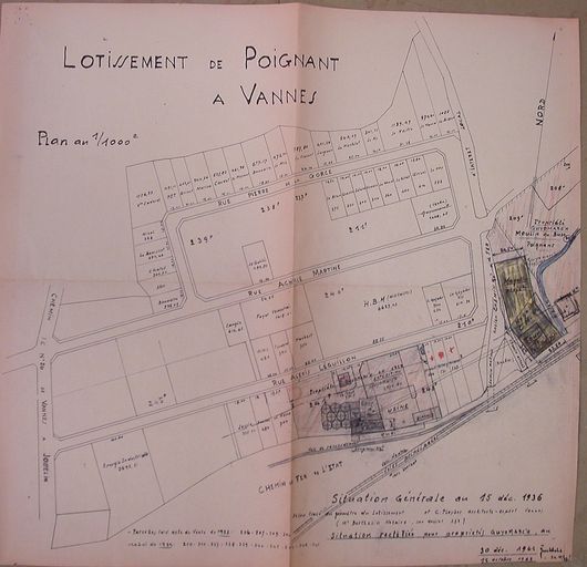 Plan du lotissement de Poignant à Vannes : situation générale au 15 décembre 1936 et situation rectifiée pour les propriétés Guyomarc'h au 30 décembre 1961 et au 12 octobre 1962. AM Vannes 5I162.Immatriculation
