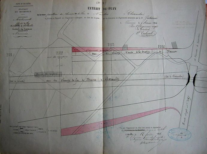 Plan d'alignement de la maison Juteau détruite aujourd'hui et située à l'emplacement du débouché de la rue Olivier de clisson, février 1866. AD 56 S 1552.Immatriculation