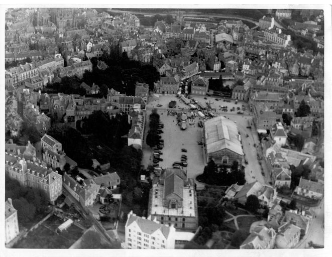 Vue aérienne de la place de la République avec la halle aux grains vers 1950. Carte postale Cim, Macon (fonds privé)Immatriculation