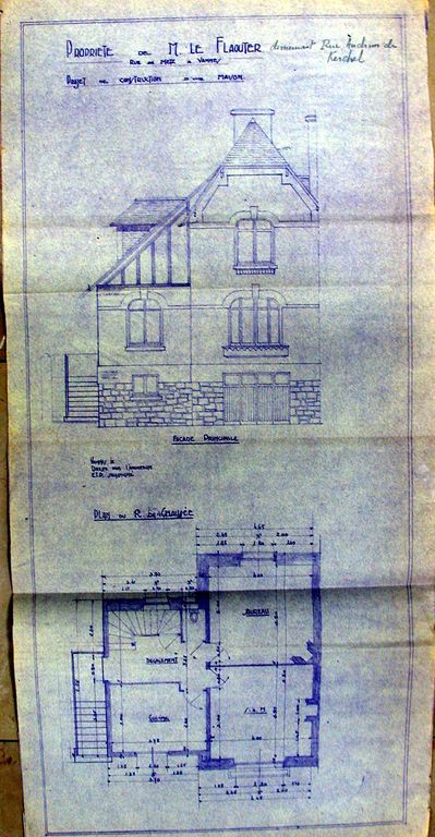 Elévation sur rue et plan du rez-de-chaussée surélevé de la maison construite pour Mr La Flaouter par A. Charron. AM Vannes 5I162.Immatriculation