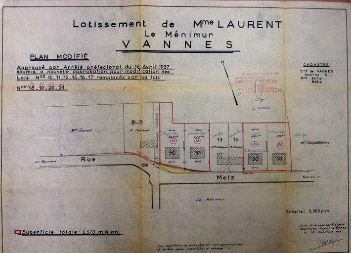 Plan du lotissement Laurent modifié par arrêté préfectoral du 16 avril 1937 pour les lots 10, 11, 12, 15, 16, 17 remplacés par les lots 10, 11, 15, 16. AM Vannes 1O221.Immatriculation